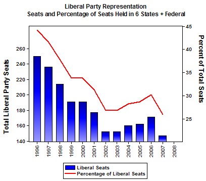 The Liberal Party, a party that likes to see itself as the true party of the Right and the natural competition to Labor (if only those pesky cow pokes would get with the program), aren’t in a particularly glorious position – holding only 26% of the total seats in the six State and Federal lower houses, down from 44.2% in 1996. Compared to the current Labor share of 57%, the Libs might want to have a quiet word with Graeme Samuel since there doesn’t appear to be a whole lot of competition going on here.