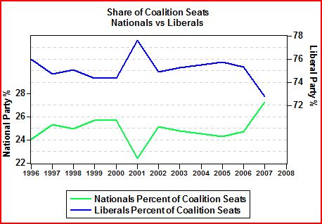 The nadir of the Nats occurred in 2001, where they held only 22.4% of all Coalition seats. But over the intervening years, the Nats’ share of Coalition-held seats has jumped up to 27.2%, their highest share of Coalition seats over the period measured. So while the conservative side of politics has been in general decline since 1996, the Liberal Party is the Party that is bleeding the most. It is they, rather than the Nats which are the primary cause of the great conservative reprimanding the electorate has been dishing out.