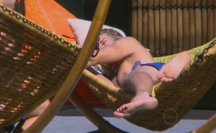 In the kitchen, it is clear that Dino has some buyer's remorse over the previous night. He gets cranky with the housemates' constant probing and wanders outside to have a snooze on a deckchair.