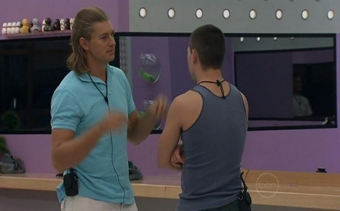 11:53pm: Jamie and Dave are still outside. Krystal is still there too. Dave is saying that in every situation in life when you're getting pissed off at something, everyone has to let off steam to somebody else. In here, it looks like bitching Dave says. Krystal says that if someone close to her does something big that pisses her off, she'll forgive them, but it will never be forgotten. She says that in here the slightest thing gets way out of control. Rob says that he has been into BB to request something, and offered to sleep somewhere else, but BB was saying no all along. Uplate update, then back outside. Dave says that everyone in the house has been through heaps. Jamie says that being nominated now isn't a problem, he's over that. He also says he wants to stay. 12:10am: Jamie says that he thinks Camilla looks for controversy. He thinks Krystal doesn't really strive to get into battles. Jamie tells him that he is always evaluating his contribution to the group. Dave asks what he thinks about Rob, but Rob comes out at that moment. Dave wonders if Rob is tired, he says he is. Jamie is worried he's getting a slight off white patch on his legs or something. Rob says he should moisturise. Jamie says he will. Jamie says that this week he hasn't had Katie to run off and sulk this week. Dave says that he thinks Jamie that yesterday and today have been must better than the previous week where he thought he was really down. Jamie says that a lot of stuff was going through his mind last week, and he says that Dave did it so well last week. 12:24am: Jamie is saying that he can't talk to one of the girls in the house. I don't know who he is talking about. Dave says that if everyone took that view the place would be in a bad 'place'. Jamie understands, but says that his positive side tells him that he can always counter an argument, prime example talking to Rob tonight. Jamie says he almost had a breakdown last week, and was over the whole BB experience. Dave says it was frustrating that he couldn't talk to Jamie about it last week because of his moods. Claire says goodnight to the boys. Dave says that last week he felt like he lost a mate last week. Dave says everyone acts in a certain way, and he felt as if he had done something to piss Jamie off, and of course he realises now that it wasn't him. Dave says the thing that hurt him was that Jamie was only concerned completely about himself last week. Jamie agrees completely. Dave says last week he thought heaps of people had stopped talking to because they all thought that he was a goner. Dave says last week he was making massive issues out of nothing. Jamie says it's a great relief to get things off his chest tonight. Comm break. 12:43am: Jamie loves doing stupid shit in front of people, being a class clown type of thing. He says he would love to be a TV presenter, he thinks he would be quick on his feet with lines, comebacks etc. Jamie says that he was glad he was out in the last round for FNL. Dave says that Office FNL theme he was the same, he was totally worried about the stand up comedy part of FNL. Dave says he would never do something like that out in the real world. We head inside to Gaelan, John and Ashley. They are discussing the different jobs in the house, especially the dishes. They say many have complained about the dishes. John says Tilli hated it. He says that Dino gave Elise the housekeeper job so she had to get up early. They all have a laugh. We cut to Rob who seems to be sleeping on the floor for some reason. Back out to the couch. John says that double they all knew Jade would be one of the ones evicted, but otherwise it was wide open. John thought he might be gone. He says that when he was up with Michael and Karen he wasn't too worried. Comm break. 12:59am: Dave has come into chat with Gaelan and Ashley. Dave is talking about climbing a mountain so he could see the entire country. No idea what country he is talking about. John says that it's great because you can see the barriers at the borders of the country. Dave says this countries biggest export is dentures. John and Dave talk about some country flags. They seem to be discussing Angola, I have no idea. Dave just keeps talking about his travels. He says he joked with someone checking his passport over the Australia/Austria joke. 1:15am: Jamie says goodnight to the small bedroom. He heads back out to the living room. Dave is still chatting to the other guys. John says he left Venice after 6 hours and was upset about that. He names heaps of places he didn't go to, and then says he left his passport behind somewhere and was denied entry and had to smuggle a train back to where his passport was. John tells a story how he got 400 Euro's out of the wall at the train station and these guys came along and he was convinced he'd be robbed, but there was one nice guy in their group and he was fine. He says he eventually got back his passport and continued his travelling. Dave talks for a bit about some country. He says he got to Poland and realised that everything was dearer than in Germany. Dave says that he could get a massive meal for $5 in Checz (not even gonna try to spell it). 1:30am: Dave is talking about catching a bus somewhere overseas. He says he travelled with some random guy. They wonder if he was gay, but he says he didn't know, but says he was hot. He had Visa issues in Latvia. Dave says he had no interest in Lithuania. Dave says he was over in Europe for 13 months, and $23,000 all up. He says he worked in Britain a bit as a landscape gardener. He says he had no idea what he was doing but he had 3 people working for him and he had to pave a huge area and put a pond in. He says that as soon as it rained it would've stuffed up completely. He says that he got heaps for doing it, but they soon realised he had no idea what he was doing. John says that all his mates just worked in pubs overseas. Gaelan says that trade jobs overseas are easy to get because they are all crap 