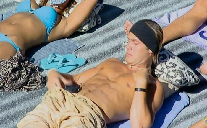 Day 59 Uplate11:38pm: Krystal and Jamie are chatting outside. Dave comes out and they change the topic back to the moths. Krystal wonders when the rain will stop. Dave hopes his farm got this for two straight days. It really is coming down. Krystal says they can always get buffed in the gym. Krystal wonders if Dave will ever cut his hair. Dave says he likes it long, but it'll eventually get cut. Krystal thinks it would look great short, but she says she loves it long too. Krystal says that Katie would've been on Rove tonight. Jamie says that some of the questions would be about him, and he says he finds it weird. Dave reckons Katie will be asked heaps about her wanting her first time to be with Jamie.